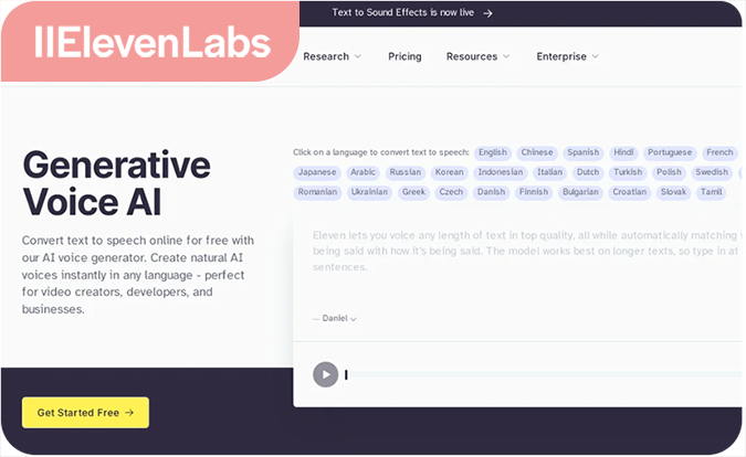 ElevenLabs is een AI-tool die natuurlijke spraak uit tekst genereert voor toepassingen zoals audioboeken en virtuele assistenten. Het biedt spraaksynthese en stemkloning voor unieke stemprofielen.
