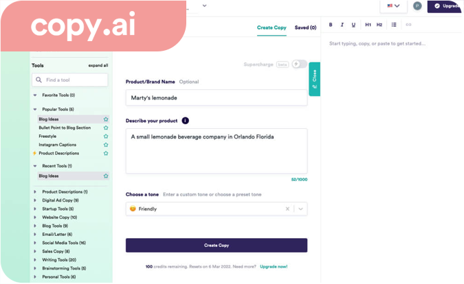 Copy.ai is een AI-tool die je helpt snel en moeiteloos content te genereren, zoals blogposts, productbeschrijvingen en social media teksten. Je creëert met minimale inspanning professionele content.