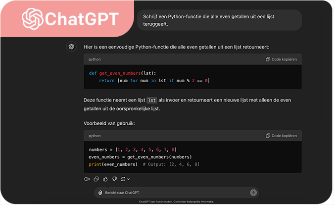 ChatGPT is een krachtige AI-tool die je helpt bij het schrijven, debuggen, en uitleggen van code in verschillende programmeertalen, perfect voor zowel beginners als ervaren ontwikkelaars.