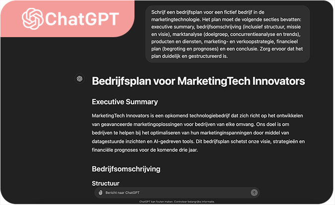 ChatGPT helpt je bij het snel en effectief opstellen van een bedrijfsplan, aangepast aan jouw behoeften. Het biedt sjablonen en advies om ervoor te zorgen dat je plan alle belangrijke elementen bevat en is afgestemd op jouw zakelijke doelen.