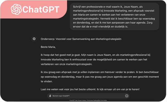 ChatGPT helpt je snel en effectief e-mails opstellen door je te begeleiden bij het formuleren van berichten die zijn afgestemd op je doel en ontvanger. Het biedt suggesties voor de juiste toon en inhoud, zodat je e-mails professioneel en doelgericht zijn.
