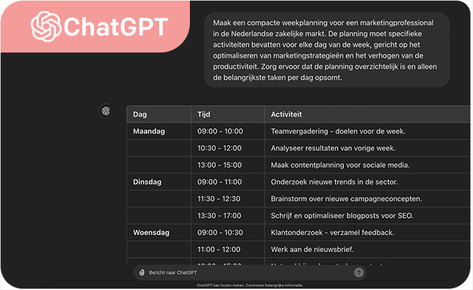 ChatGPT is een AI-tool die je helpt je tijd te beheren en je planning te optimaliseren. Of je nu dagelijkse taken organiseert of een weekplanning maakt, ChatGPT biedt slimme, gepersonaliseerde oplossingen op maat.