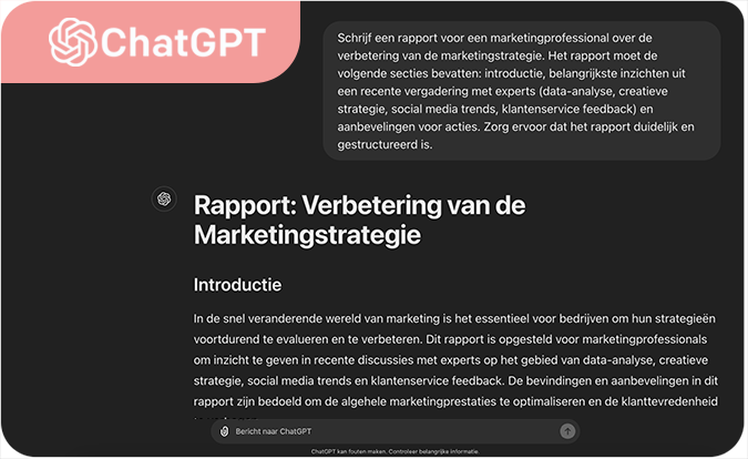 ChatGPT helpt je bij het snel en nauwkeurig opstellen van verslagen en rapporten, afgestemd op je specifieke behoeften. Het biedt gerichte suggesties en sjablonen, zodat je documenten effectief worden samengesteld en alle relevante informatie bevat.