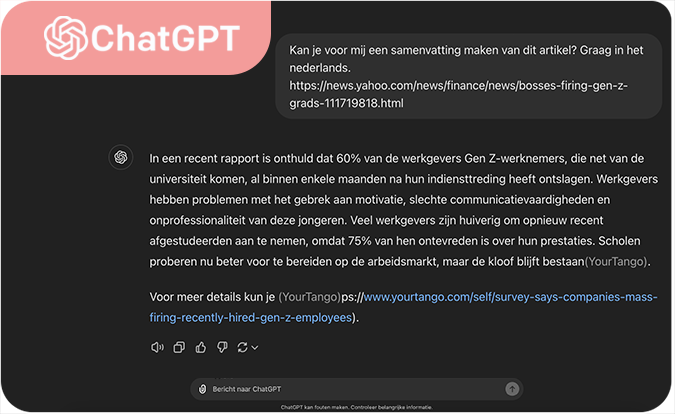 ChatGPT helpt je snel grote teksten samen te vatten, zowel door tekst in te voeren als door documenten te uploaden. Het analyseert de belangrijkste punten en kerninformatie, zodat je snel een overzicht krijgt zonder de volledige tekst te hoeven doorlezen.