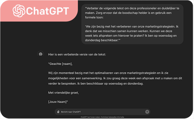 ChatGPT helpt je bij het snel herschrijven van teksten, zodat ze duidelijker, krachtiger, of beter afgestemd zijn op je doelgroep. Het biedt gerichte suggesties om de toon, structuur en inhoud te verbeteren, zodat je boodschap effectiever overkomt.