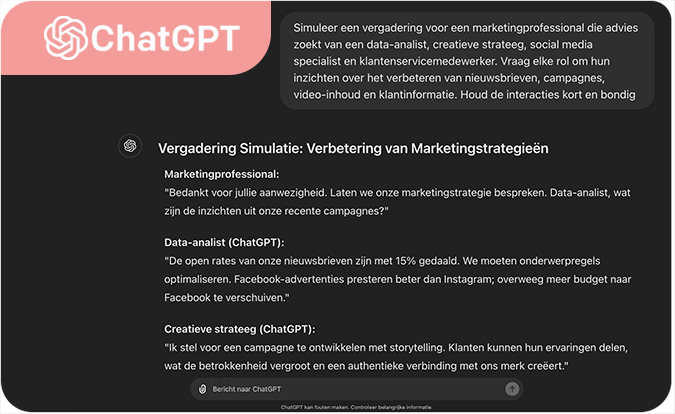 ChatGPT simuleert vergaderingen door advies te geven vanuit rollen zoals manager, klant of teamlid. Dit helpt je verschillende perspectieven te verkennen en je communicatieve vaardigheden te verbeteren door te oefenen met uiteenlopende scenario’s.