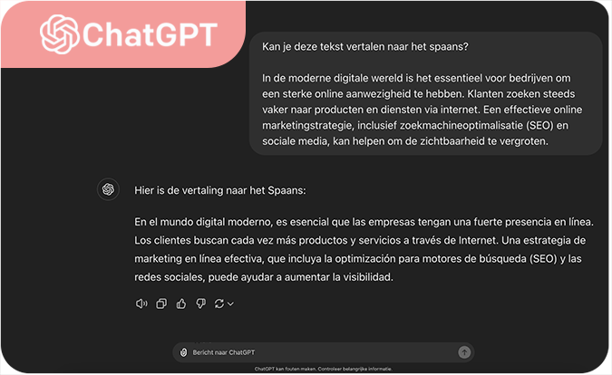 ChatGPT helpt je snel en nauwkeurig documenten te vertalen, afgestemd op jouw taalbehoeften. Het biedt vertalingen die contextueel relevant zijn en rekening houden met specifieke terminologie, zodat je documenten professioneel overkomen.