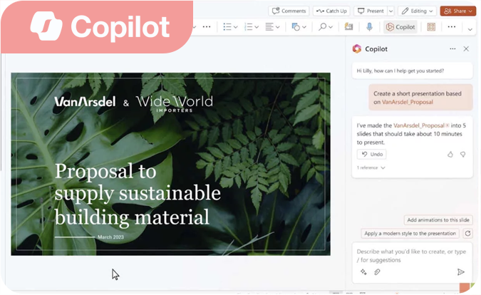 Microsoft Copilot is je AI-assistent in Microsoft 365 voor het maken van professionele presentaties. Copilot biedt slimme suggesties, contentcreatie, en designverbeteringen in PowerPoint.
